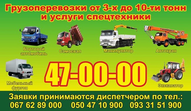 - Спецтехника: бортовой автомобиль, самосвал, манипулятор, автокран, мебельный фургон, экскаватор, эвакуатор;